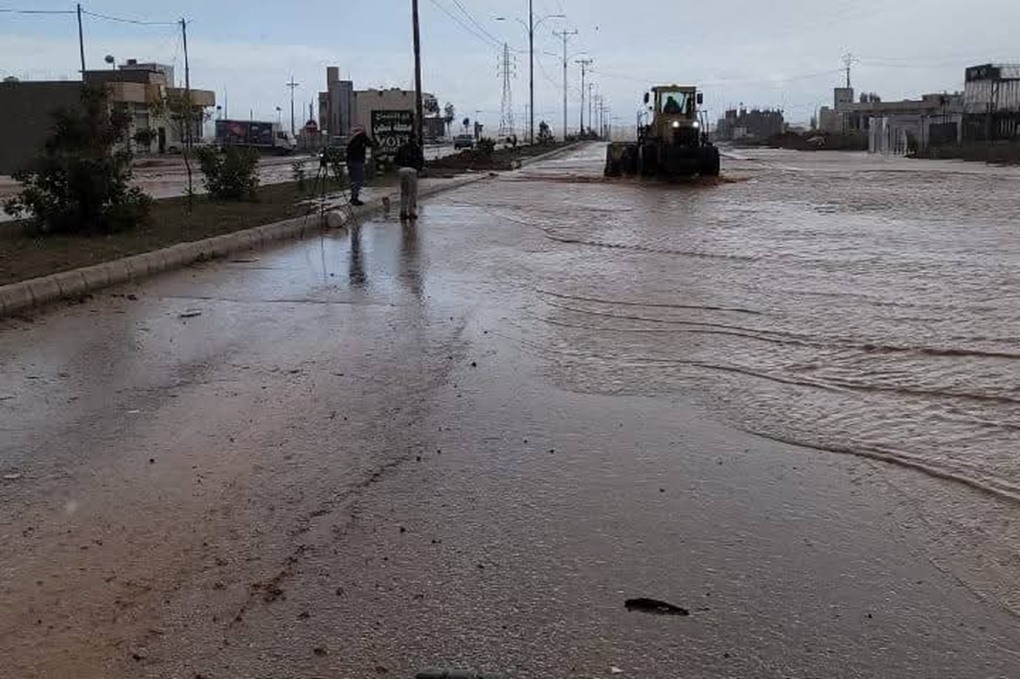 كوادر بلدية السرحان تعمل على فتح جسر على طريق المفرق جابر أغلقته غزارة الأمطار