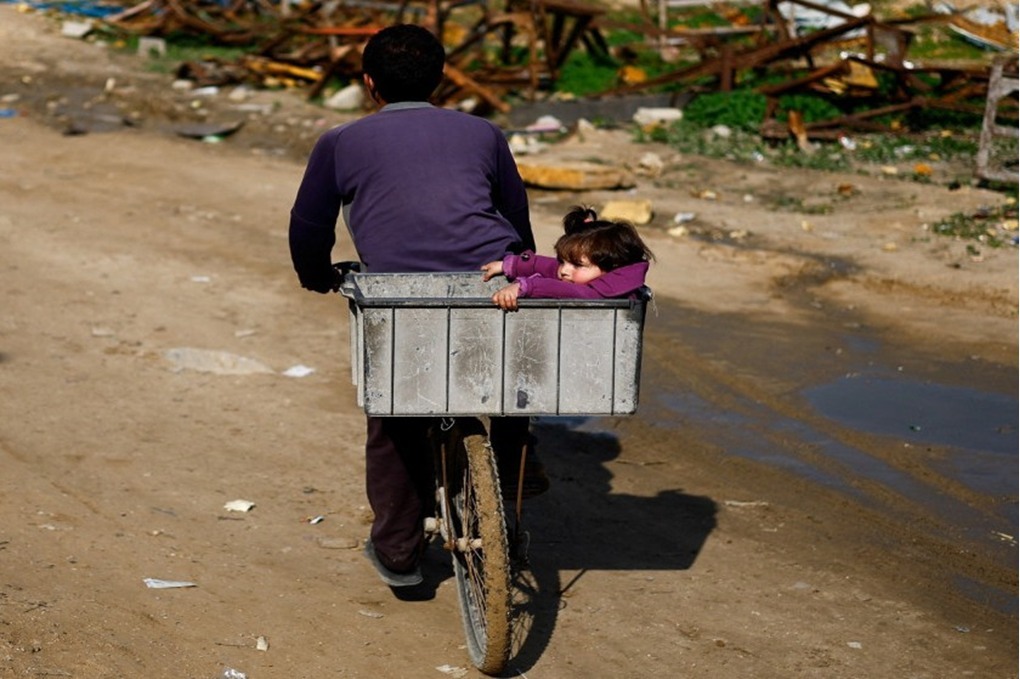 غزي يبحث بغربال عن رفات زوجته وأطفاله / فيديو